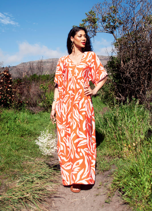 Gabriella kaftan in patchwork Desert Rose rayon blend