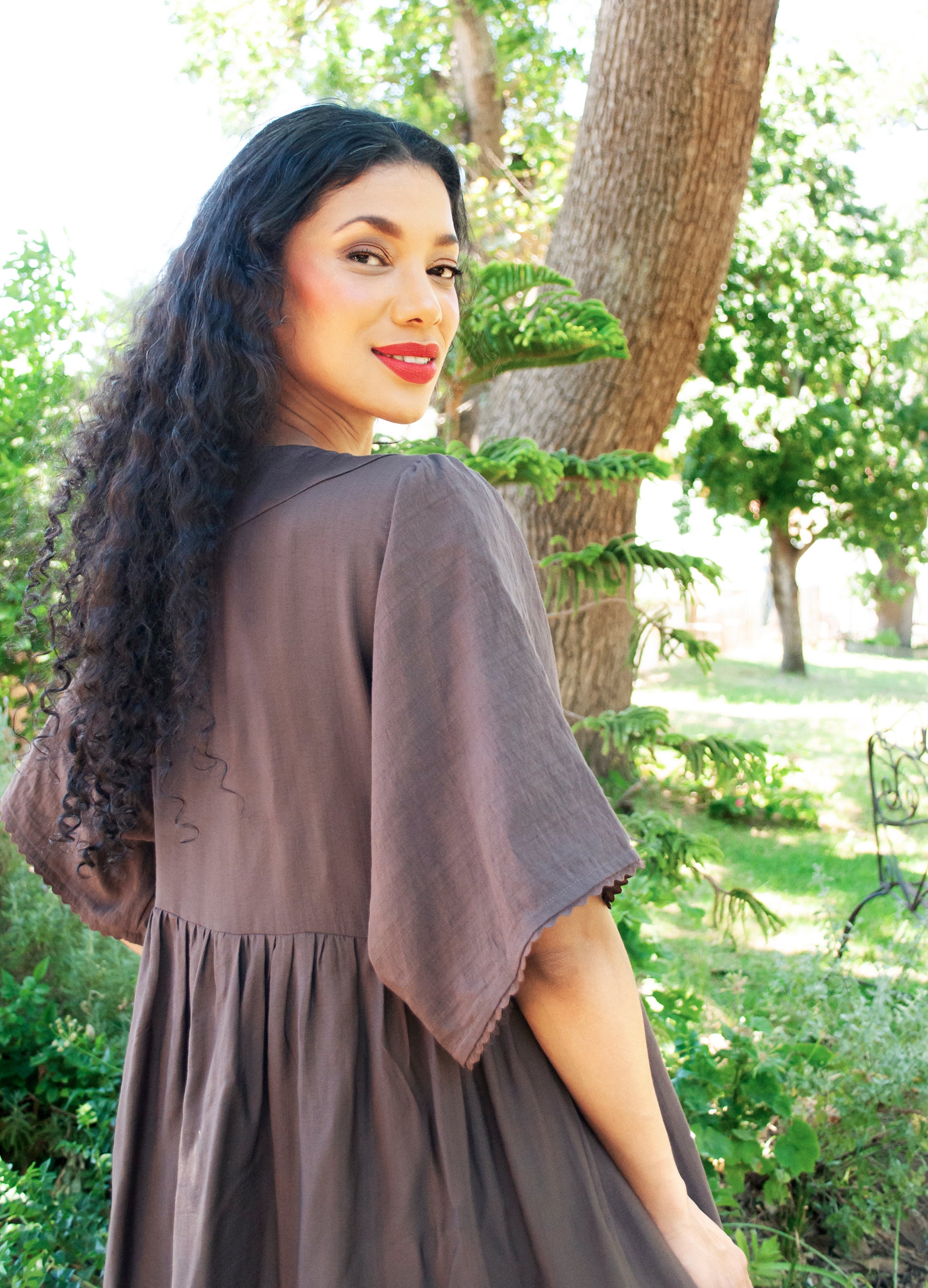 Ethereal, spacious and feminine, our Clara kaftan dress makes a statement while keeping you cool on hot summer days. This maxi length dress is built on a loose-fitting dolman style block, with a wide v-shaped neckline, ruching detail and side slits. Clara features fine scallop lace trim on the sleeves and, best of all, side pockets!