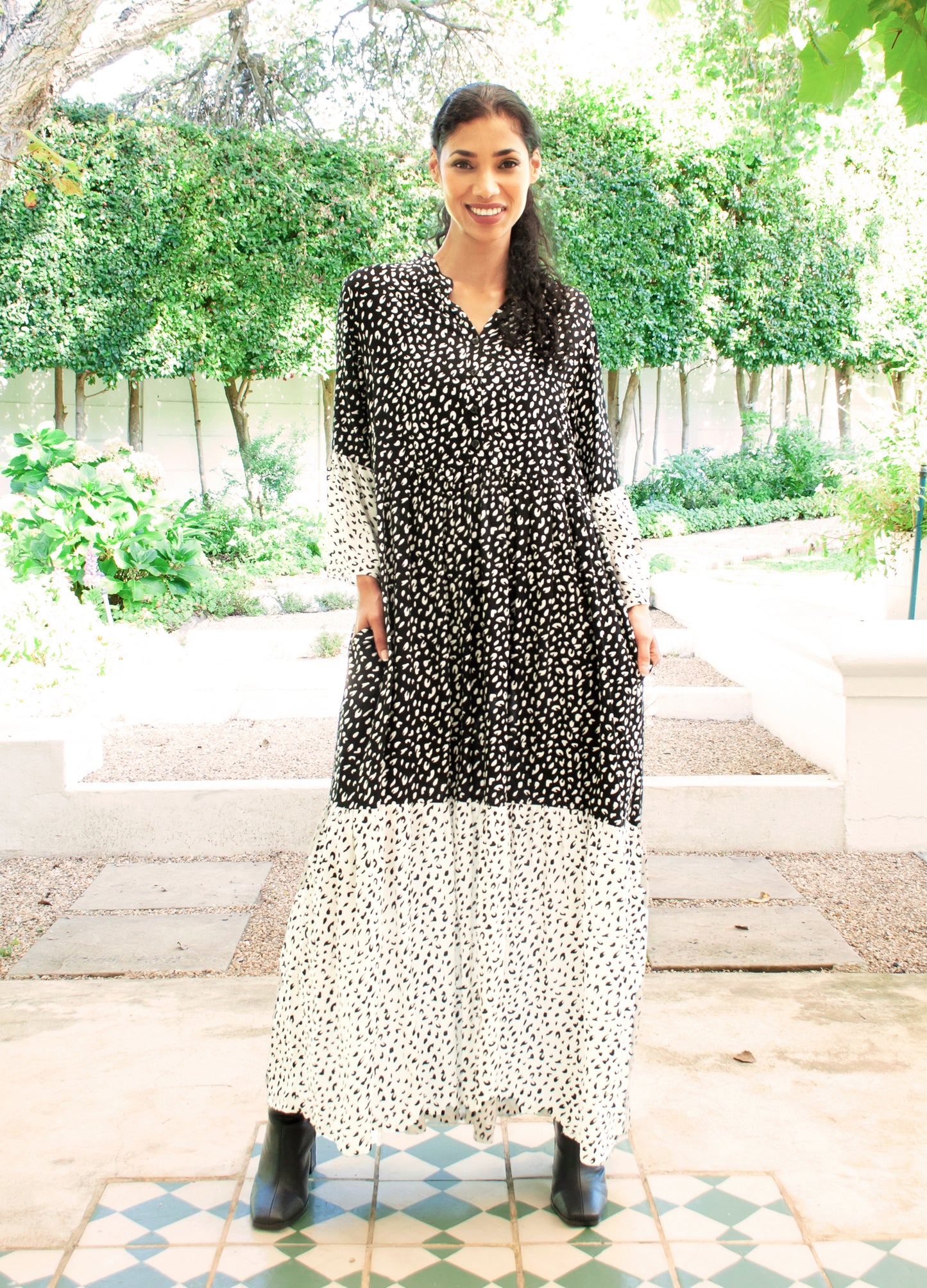 Meet our best-selling printed maxi tiered dress- the Cora maxi dress . This striking feminine maxi dress exudes sophisticated ease, with ruffled tiers falling gracefully from the effortless waistline. The breezy sleeves and skirt feature ruching detail and the neckline opening can be adjusted with fine mother of pearl buttons.