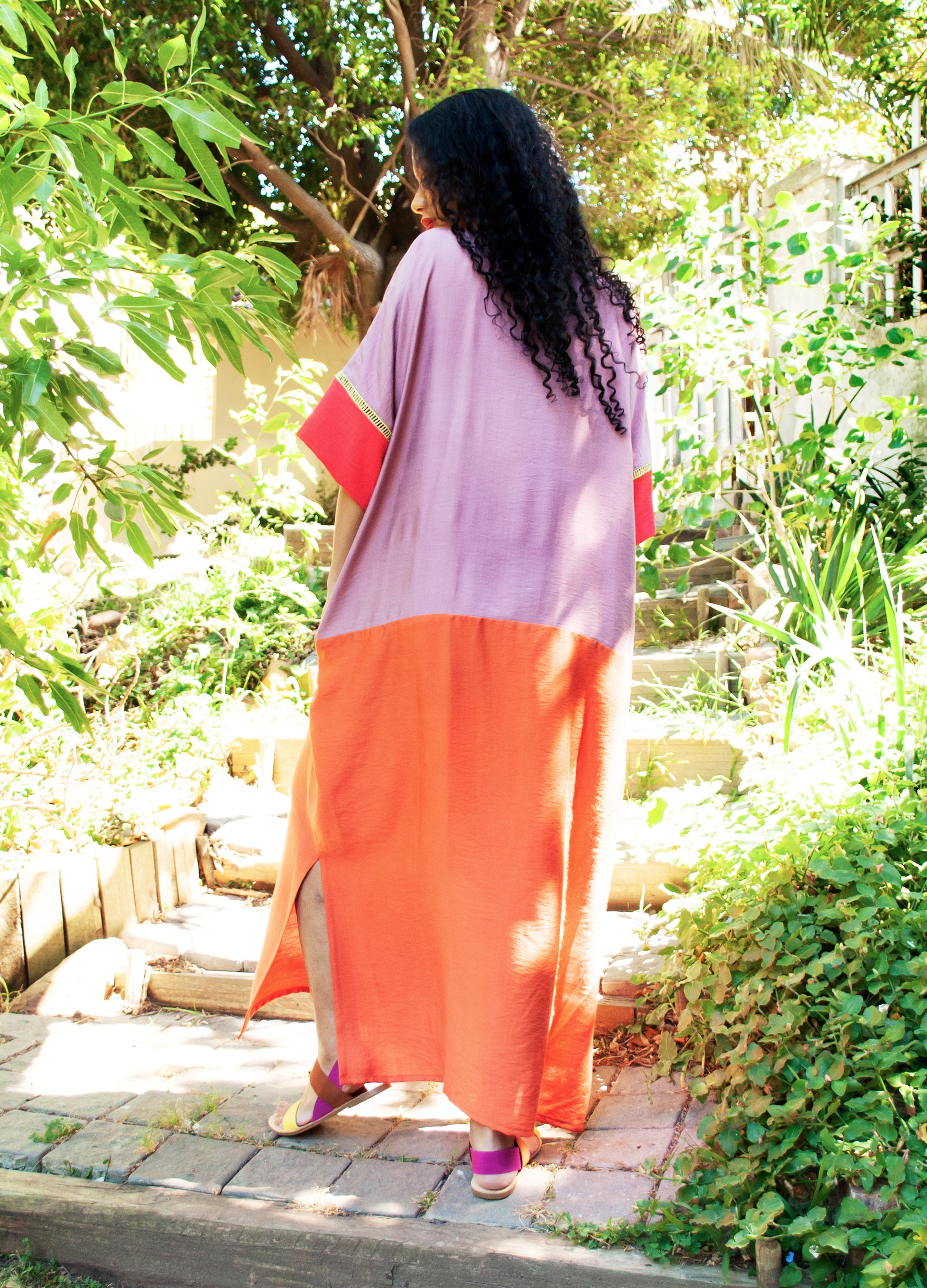 Meet Gabriella- our statement kaftan dress for any season. This magnificent dress features striking colour-block detail with fine ladder lace sleeve trim and a tie-belt that transforms her silhouette to a modern, slouchy dress.The split neckline and side slits add cool comfort and movement, and best of all, she has pockets!