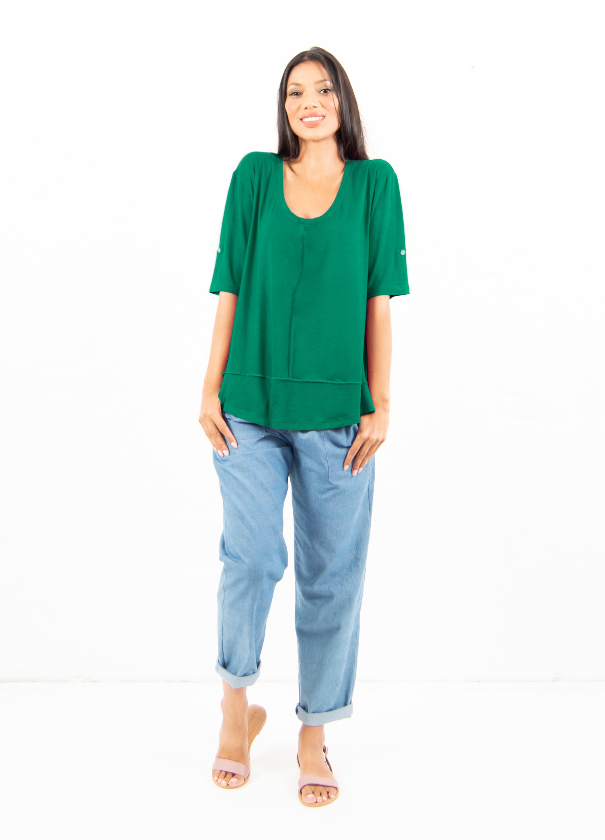 Get the casual sophisticated summer feel with our Lourdes t-shirt. This easy-fit t-shirt is made of soft viscose jersey knit, and features fine exposed overlocking detail on the style-line seams. The elbow length sleeves have tabs for an easy roll-up cuff, the side seams have slits and the back is slightly longer for extra coverage.