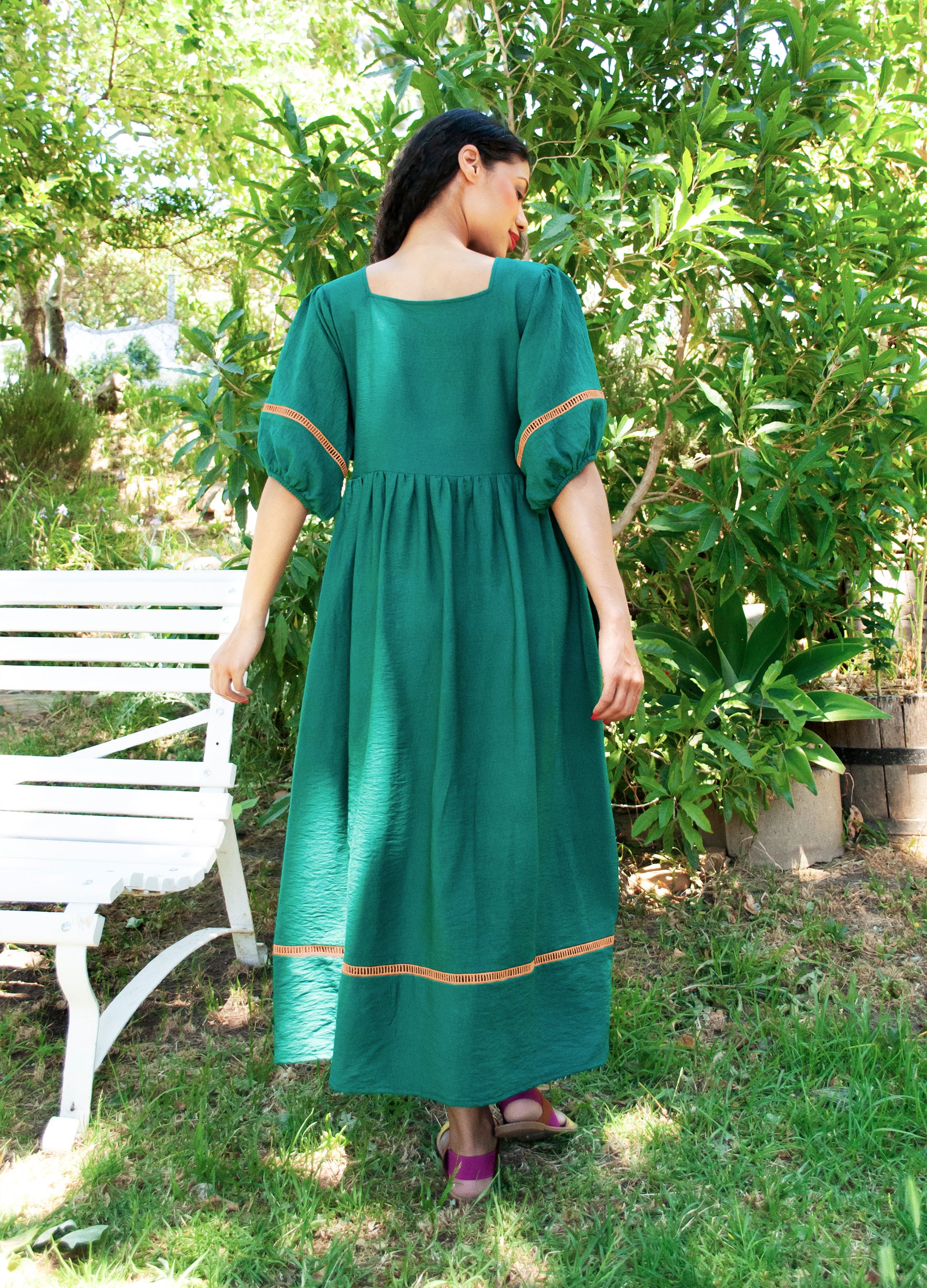 Our Luna Dress is a romantic new take on our best-selling Clara kaftan dress. With a reversible neckline — a modern square cut on one side, a soft tie on the other — it’s designed to be worn your way.Dolman sleeves with gentle elastic hems and delicate ladder-lace trims add effortless charm, while the over-the-calf length makes Luna as versatile as it is feminine. Best of all, she has pockets!
