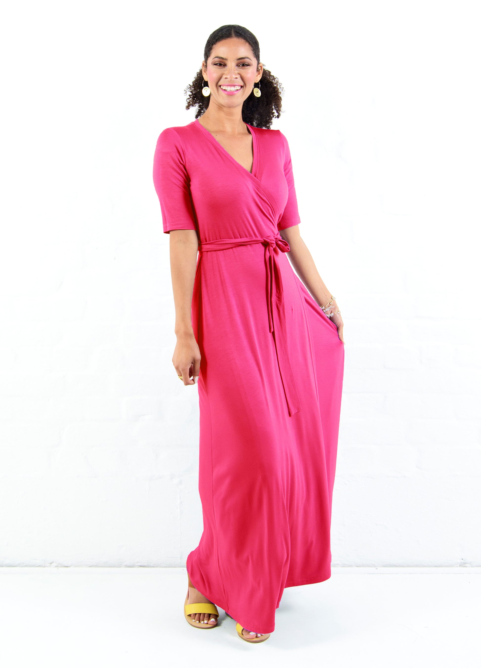 Magnolia is made of soft viscose jersey knit, and features an adjustable functional wrap front with ties and an A-line skirt. The sleeves are elbow length, and the hem falls just over the ankle.